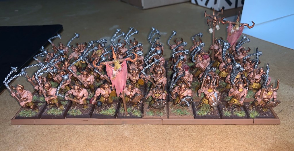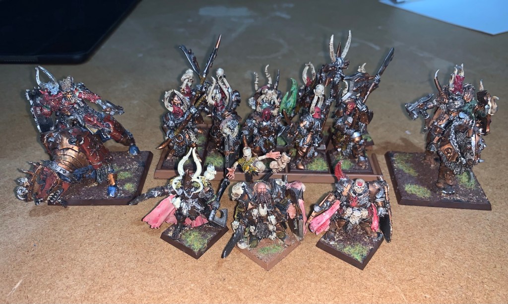 There was an expansion, Apocalypse, coming out which allowed bigger armies to be used and I invested in it. I ordered the book, a huge tank and a Battle Company, which comprised of over 100 miniatures that had to be built and painted. It took me over six weeks to build and paint it all up but enjoyed doing it. I kept adding more units to the army and decided I wanted to try and make at least four companies. I think I got to nearly three full companies by the end and they were all painted. Whilst I was building them up, I started other armies and I think I ended up with about six or seven different armies all with different play styles. Along this journey, some of my gaming colleagues tried to convince me to play Warhammer Fantasy but I was adamant I wouldn’t. That was until I saw the Warriors of Chaos stuff that was coming out. I got one of the collection boxes and the army book. The models were really nice and I did a really good paint job on them. It turned out to be one of my favourite armies I had and I still have it to this day. It gave me another game to play but I didn’t want to get too much as I had nowhere to put it all.