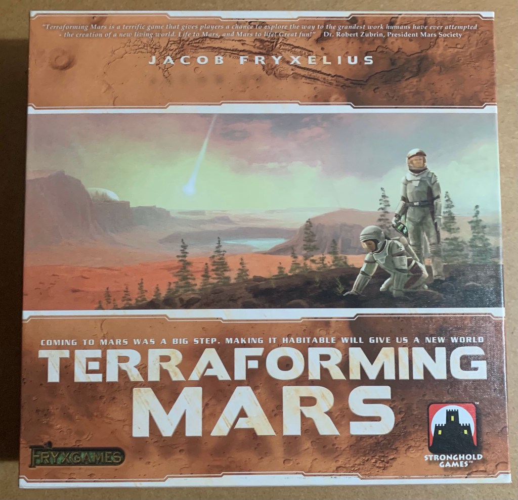 Terraforming Mars is a game for one to five players and was first published in 2016 by FryxGames. Since then it has gone on to become one of the top board game ranked by BoardGameGeek. Since it’s release it has had five expansions released for it (none of which I own…yet). The object of the game is pretty obvious by the title, terraform the planet Mars. This is done by raising the temperature from -30 to +8 degrees, raising the oxygen levels to 14% and cover 9% of the surface with water which is all done through various means. Each player represents a corporation wanting to get ahead and terraform the planet through different methods such as standard projects and patents but first they have to buy them. The game takes place over a number of generations until all three goals are met (or fourteen if you play solo).